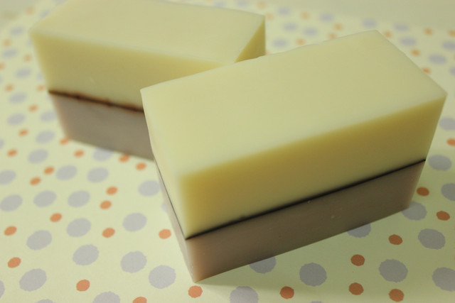 接下來是繼珍珠奶茶後的另一飲品XD ~仙草凍奶茶!!! 噹噹~配方跟上面的小兔子是一樣的,做了一大鍋,入模時分成兩種造型,一時興起,就將上次做的備長炭皂切剩的長形皂塊丟入當仙草凍囉。因為配方裡含有小麥胚芽油,所以皂色呈現奶茶色,更加像真的仙草凍奶茶了!