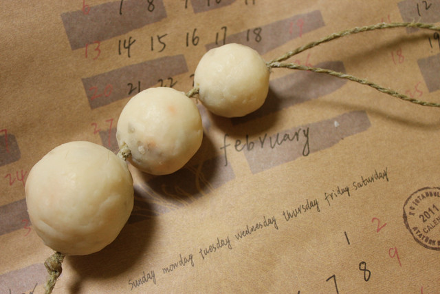 切餘的碎邊也可揉成圓球,繫上麻繩當作丸子吊串喔!掛在洗手台邊非常方便又好看呢!