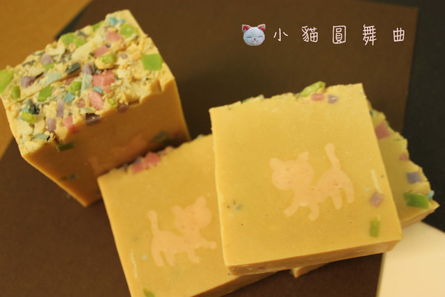 構想是把之前蛋糕皂留下的一些皂碎片丟入皂液中,讓小貓有點像在碎石道上散布,但又不能灑太多,以免皂體會鬆散,所以主要還是把碎片灑在上緣,綠的、藍的、紅的...讓皂看起來更繽紛了! 下次來做狗狗吧^_^ 嘻嘻hellosweetsoap 發表在 痞客邦 留言(0) 人氣(15)